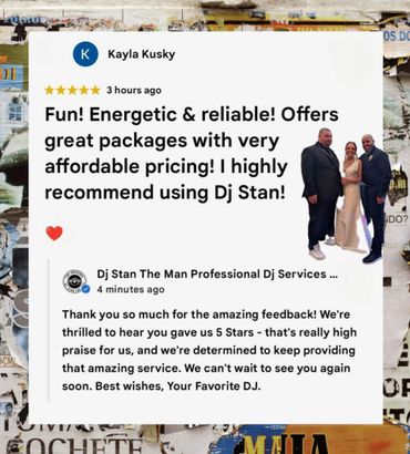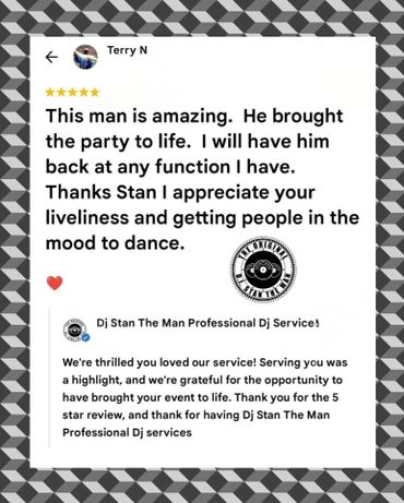 Don't just take our word for it - check out what our clients have to say about DJ Stan The Man Professional DJ Services's DJ services. Our testimonials speak for themselves, and we're confident that you'll love our work too.